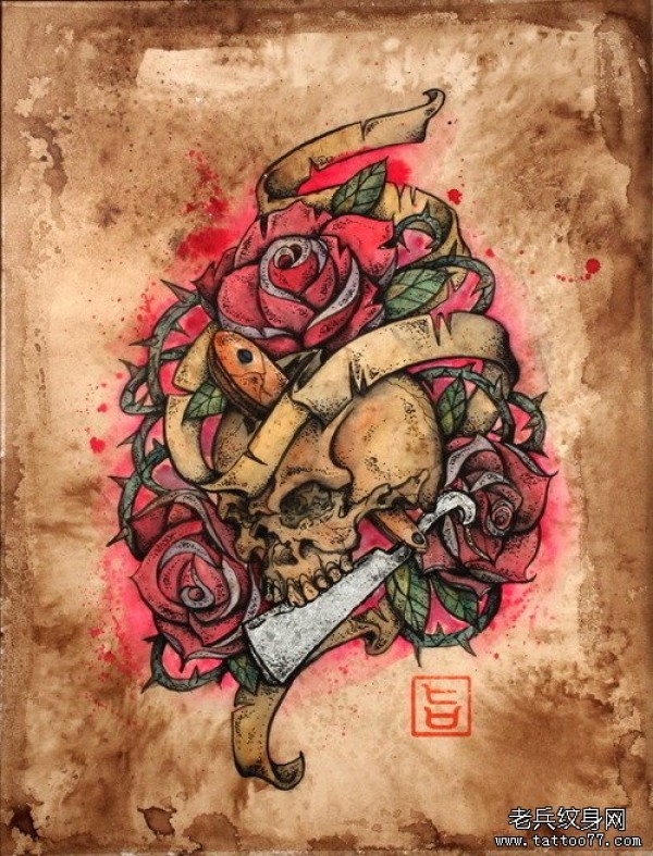 时尚精美的new school骷髅玫瑰花纹身图案_玫瑰花纹身图案大全_纹身图吧