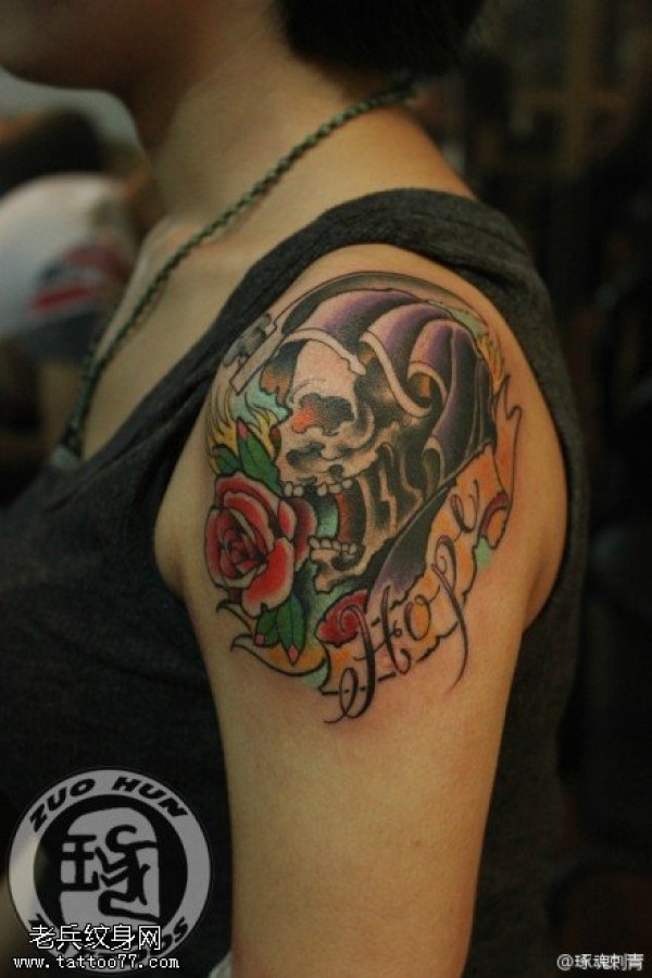 手臂彩色骷髅玫瑰花字母纹身图案_玫瑰花纹身图案大全_纹身图吧