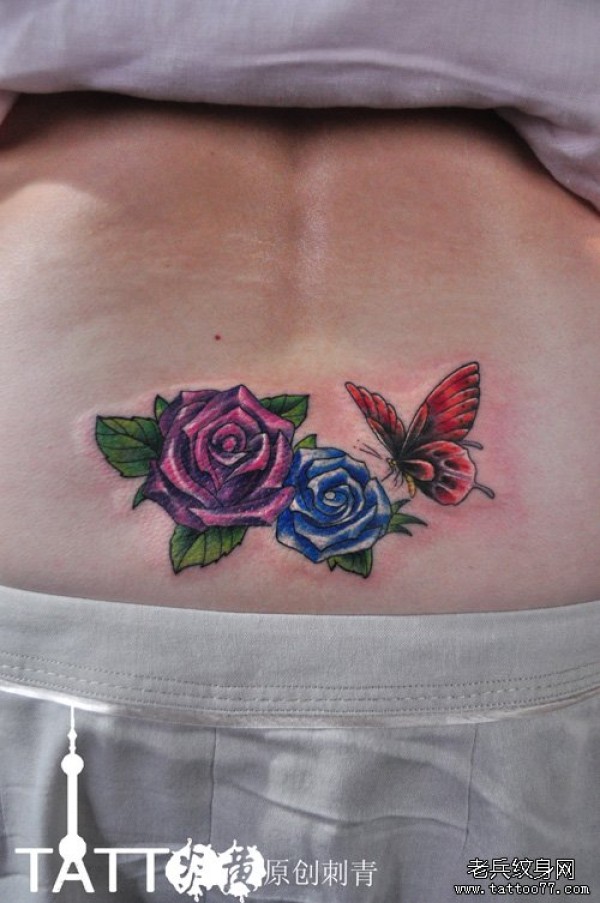 美女腰部漂亮的彩色玫瑰花与蝴蝶纹身图案_玫瑰花纹身图案大全_纹身图吧