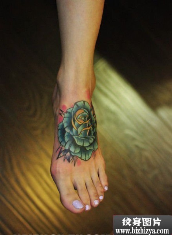 蓝色玫瑰花脚背纹身图案图片_玫瑰花纹身图案大全_纹身图吧