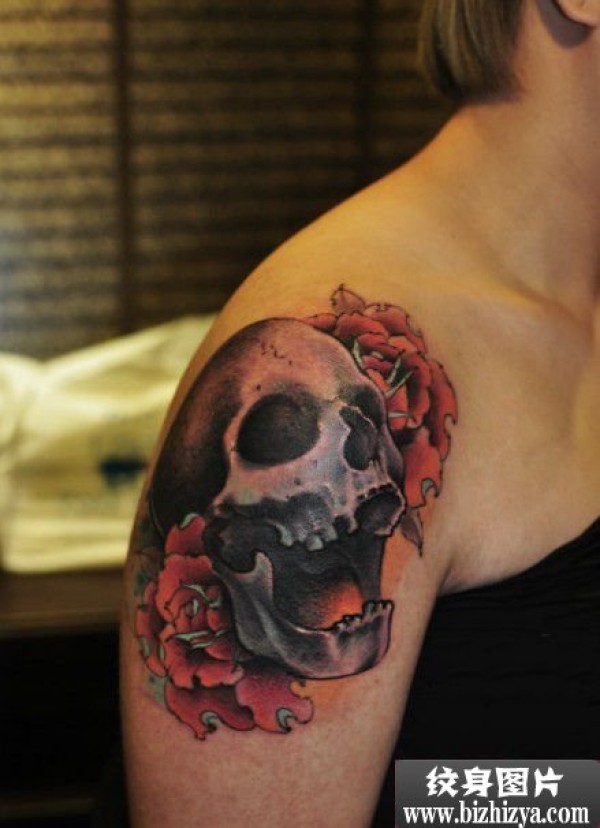 欧美骷髅玫瑰肩部纹身图案图片_玫瑰花纹身图案大全_纹身图吧