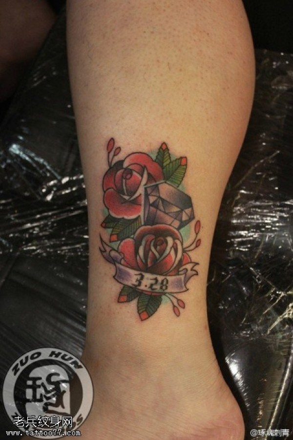 脚踝彩色钻石玫瑰花纹身图案_玫瑰花纹身图案大全_纹身图吧
