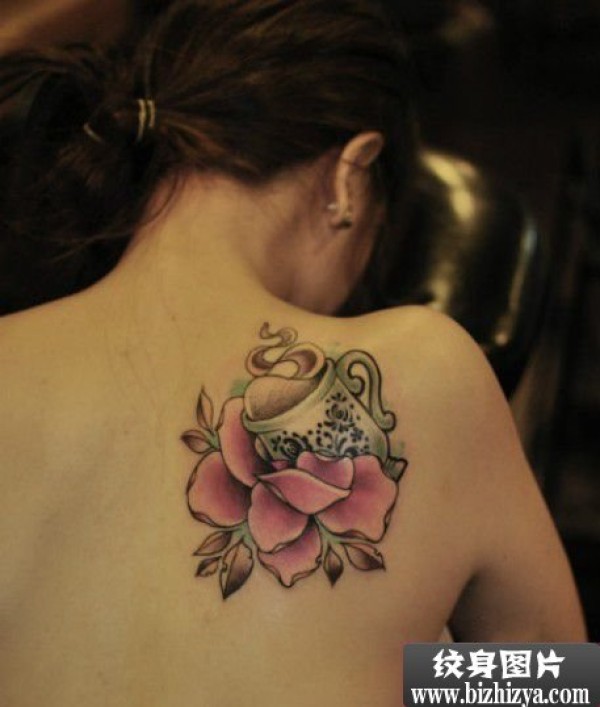 经典咖啡杯玫瑰肩部纹身图案图片_玫瑰花纹身图案大全_纹身图吧