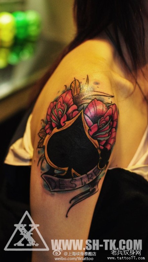 手臂漂亮的new school黑桃与玫瑰花纹身图案_玫瑰花纹身图案大全_纹身图吧