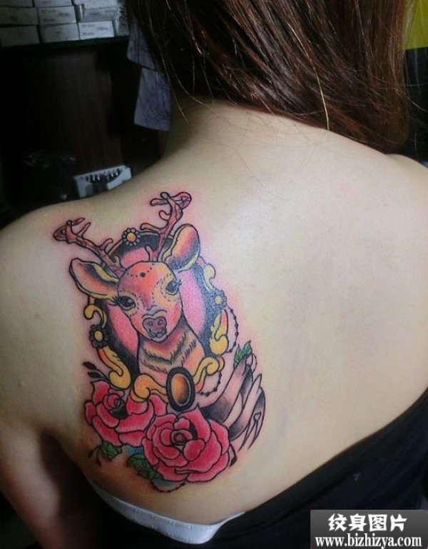 彩色可爱麋鹿玫瑰纹身图案图片_玫瑰花纹身图案大全_纹身图吧