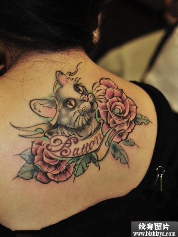 调皮猫咪玫瑰花背上纹身图案图片_玫瑰花纹身图案大全_纹身图吧