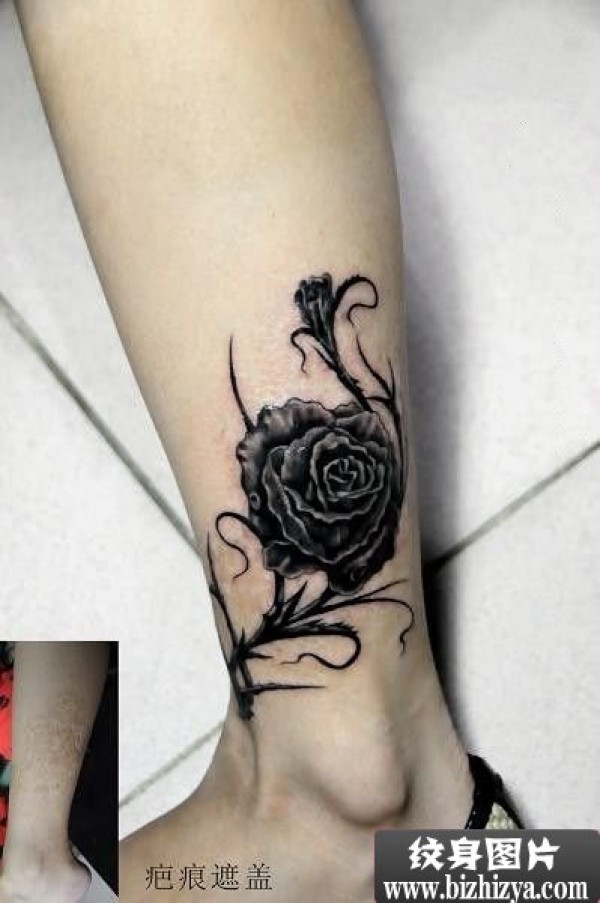 腿部疤痕遮盖黑玫瑰纹身图案图片_玫瑰花纹身图案大全_纹身图吧