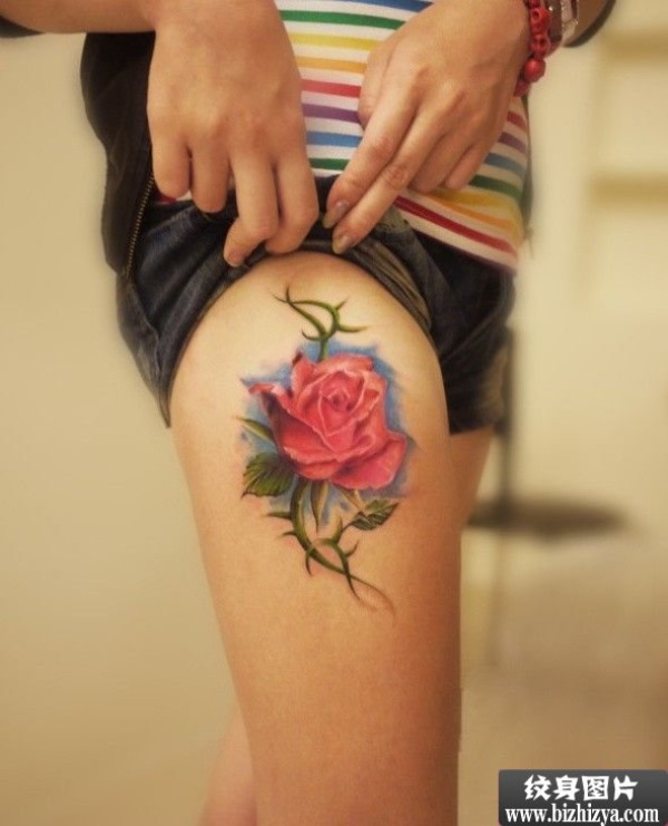 大腿粉色玫瑰刺青图案图片_玫瑰花纹身图案大全_纹身图吧