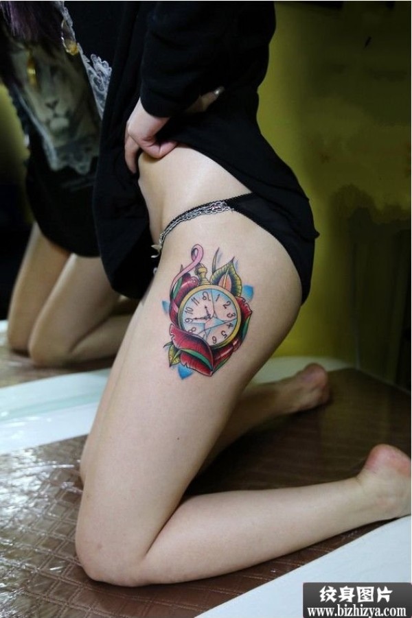 美女大腿玫瑰时钟时尚纹身图案图片_玫瑰花纹身图案大全_纹身图吧