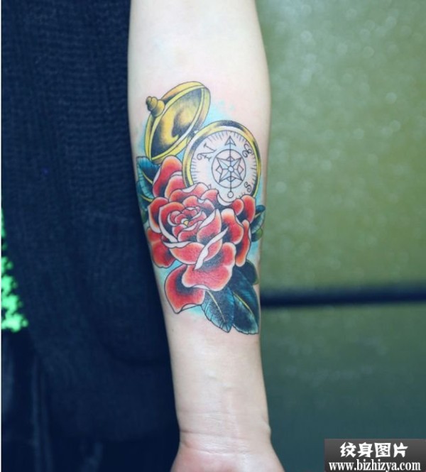 手臂玫瑰指南针时尚纹身图案图片_玫瑰花纹身图案大全_纹身图吧