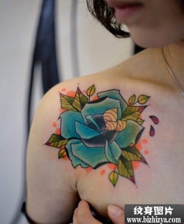 肩部蓝色玫瑰花纹身图案图片_玫瑰花纹身图案大全_纹身图吧