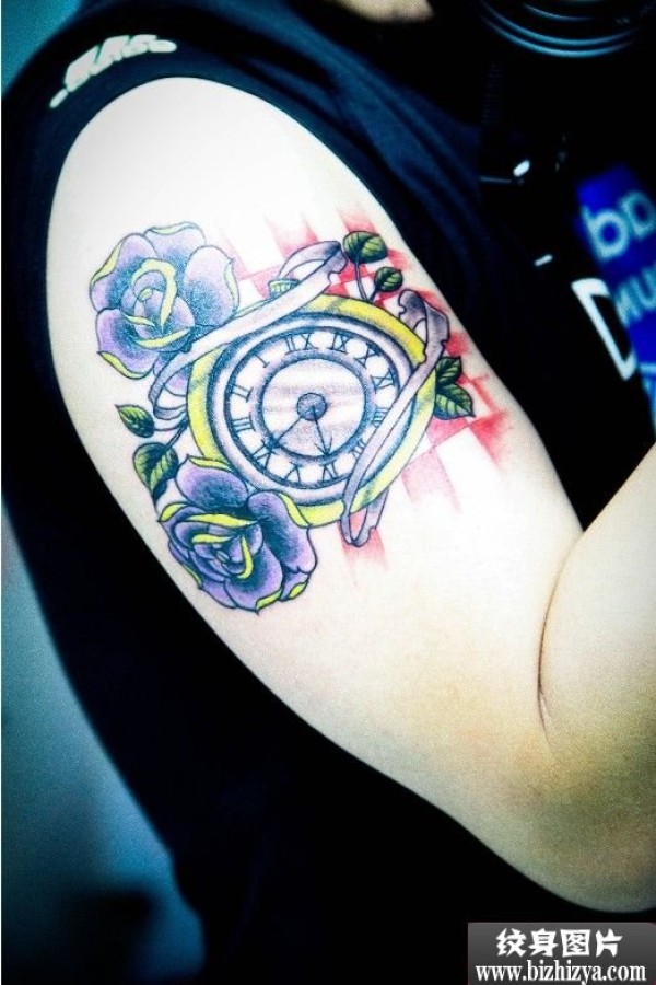 大臂玫瑰怀表复古纹身图案图片_玫瑰花纹身图案大全_纹身图吧