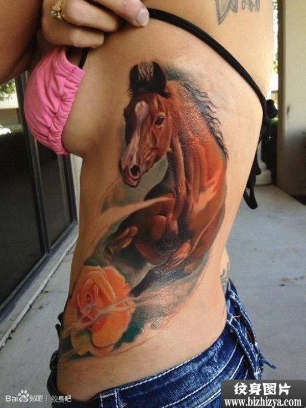 女性侧身玫瑰和骏马纹身作品_玫瑰花纹身图案大全_纹身图吧