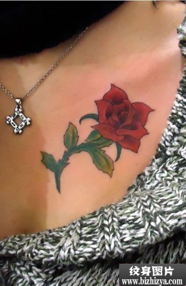 胸前爱情玫瑰时尚纹身图案图片_玫瑰花纹身图案大全_纹身图吧