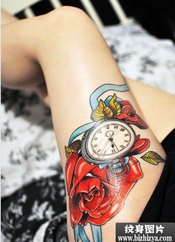 女生腿部个性玫瑰时钟纹身图案图片_玫瑰花纹身图案大全_纹身图吧