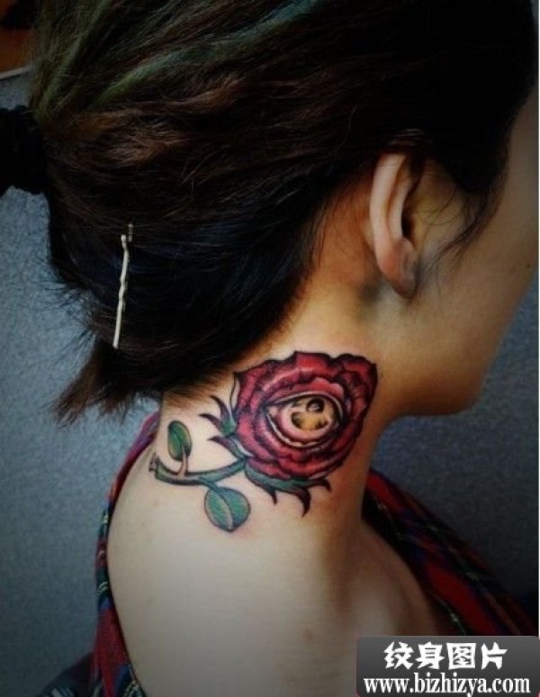女生个性后颈黑白玫瑰唯美纹身_玫瑰花纹身图案大全_纹身图吧