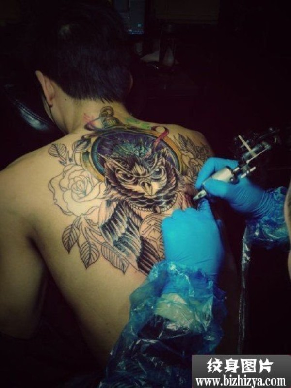 后背猫头鹰玫瑰纹身过程图案图片_玫瑰花纹身图案大全_纹身图吧