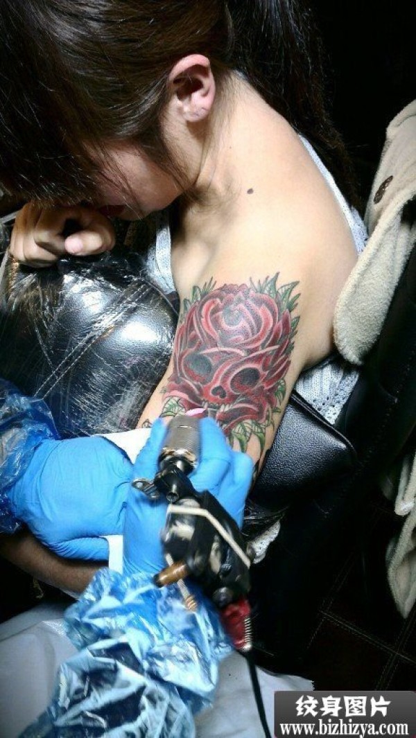 女生手臂个性玫瑰骷髅纹身过程图案图片_玫瑰花纹身图案大全_纹身图吧