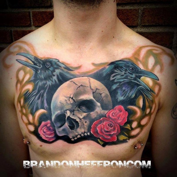 男人胸口一款霸气时尚的骷髅玫瑰纹身图案_玫瑰花纹身图案大全_纹身图吧