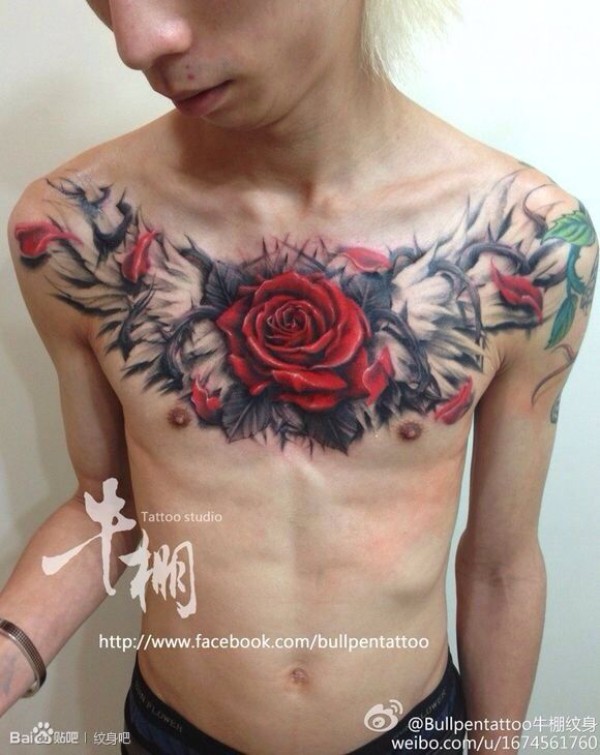 男人胸前一款霸气时尚的玫瑰花纹身图案_玫瑰花纹身图案大全_纹身图吧