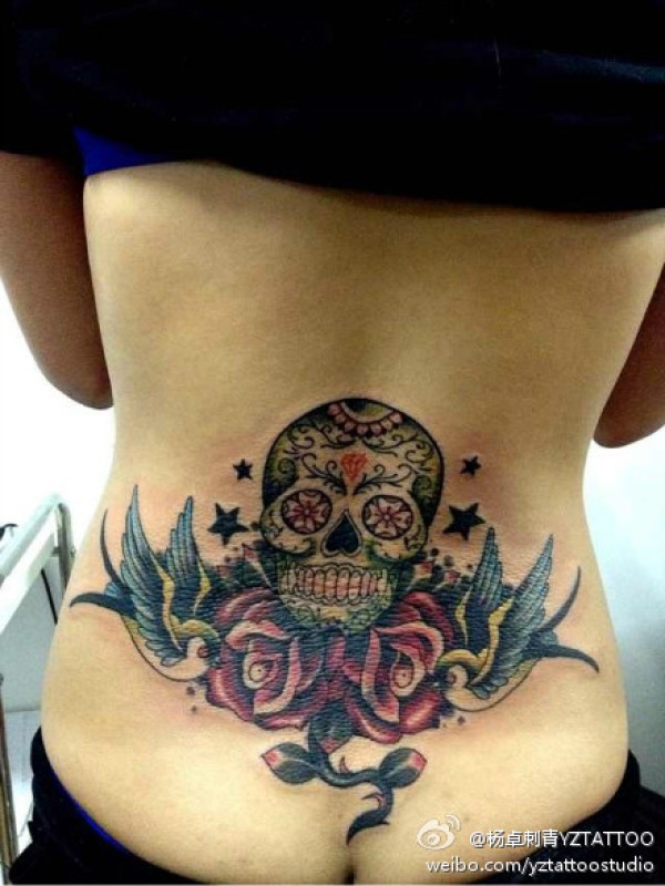 女生腰部潮流经典的骷髅玫瑰纹身图案_玫瑰花纹身图案大全_纹身图吧