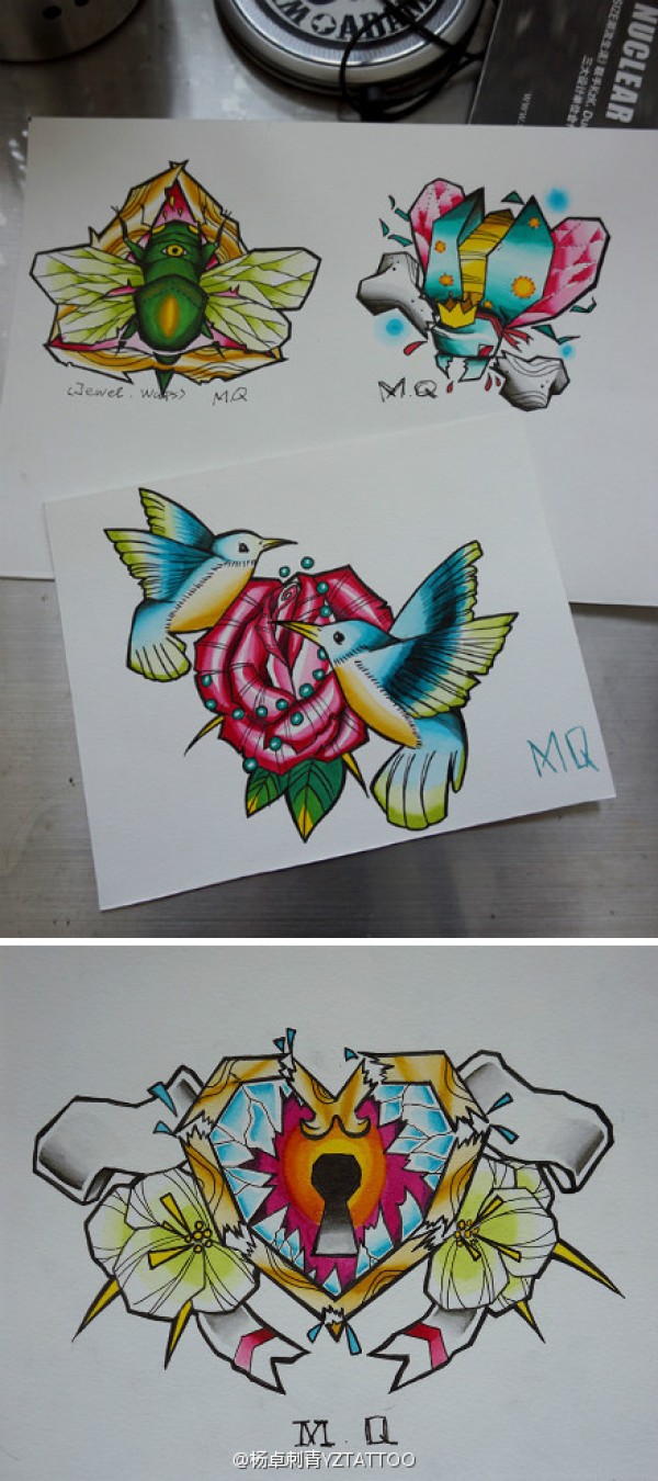 一组精美的彩色爱心锁小鸟玫瑰纹身图案_玫瑰花纹身图案大全_纹身图吧