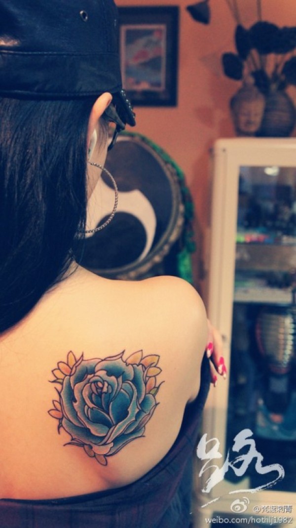 耳后蓝色妖姬玫瑰纹身_玫瑰花纹身图案大全_纹身图吧
