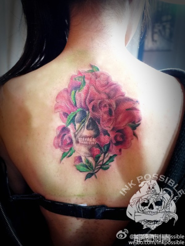女生后背经典帅气的骷髅与玫瑰花纹身图案_玫瑰花纹身图案大全_纹身图吧