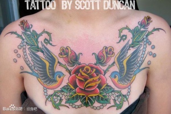 时尚胸部玫瑰花纹身_玫瑰花纹身图案大全_纹身图吧