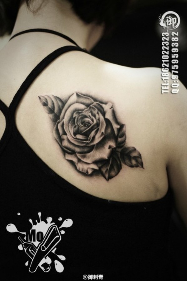 女生肩背潮流时尚的黑灰玫瑰花纹身图案_玫瑰花纹身图案大全_纹身图吧