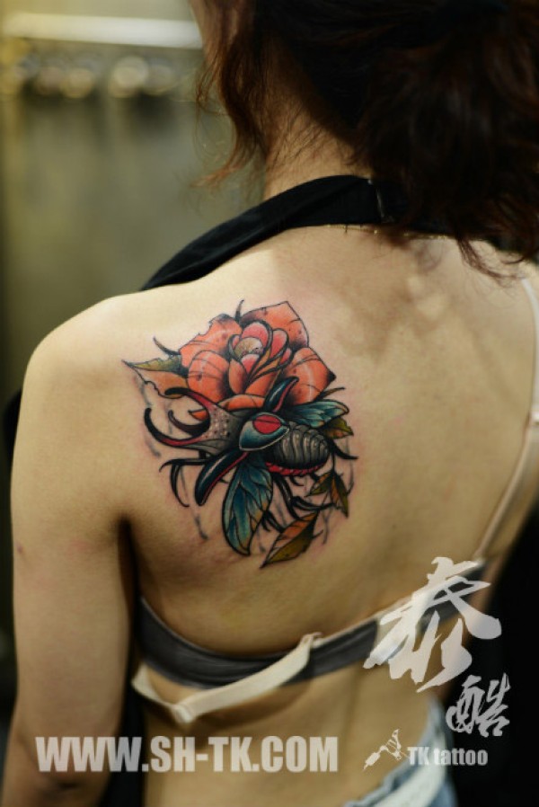 女生肩背精美的甲虫与玫瑰花纹身图案_玫瑰花纹身图案大全_纹身图吧