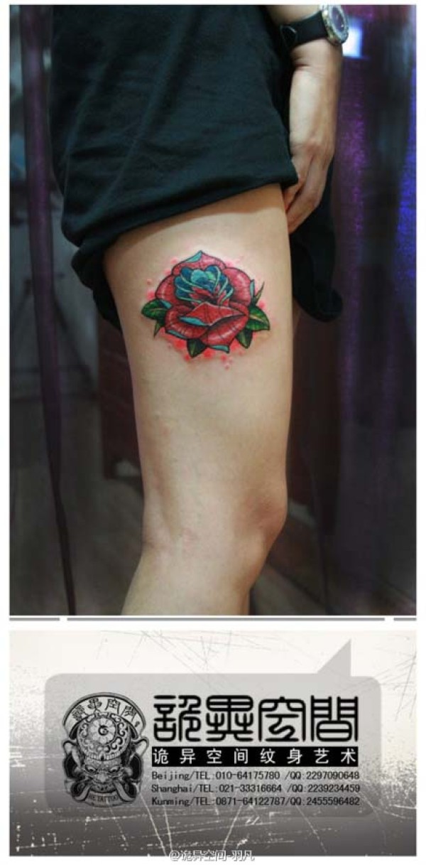美女大腿处唯美潮流的彩色玫瑰花纹身图案_玫瑰花纹身图案大全_纹身图吧