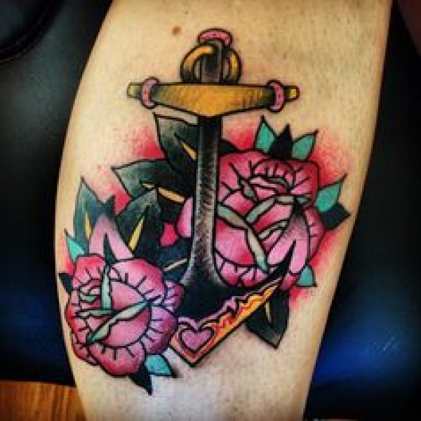 分享一款彩色潮流的船锚玫瑰花纹身图案_玫瑰花纹身图案大全_纹身图吧