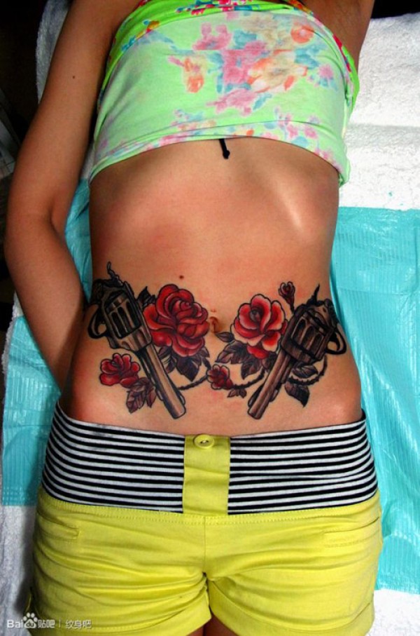 女生腹部潮流经典的手枪玫瑰纹身图案_玫瑰花纹身图案大全_纹身图吧