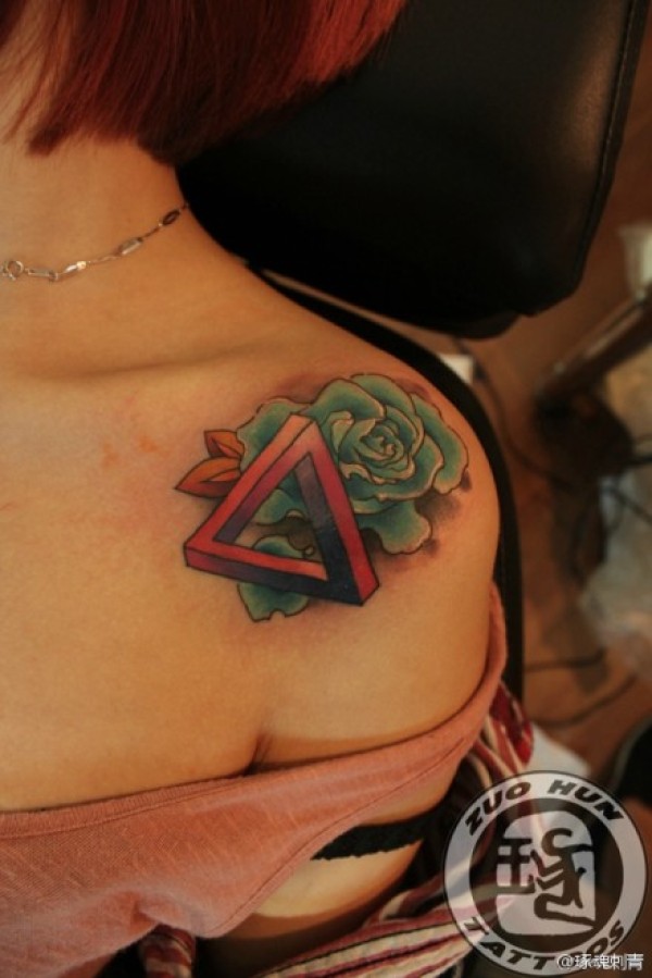 美女肩膀处潮流好看的三角与玫瑰纹身图案_玫瑰花纹身图案大全_纹身图吧