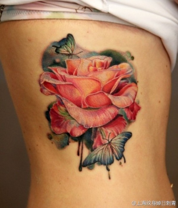 美女侧腰唯美精美的彩色玫瑰纹身图案_玫瑰花纹身图案大全_纹身图吧