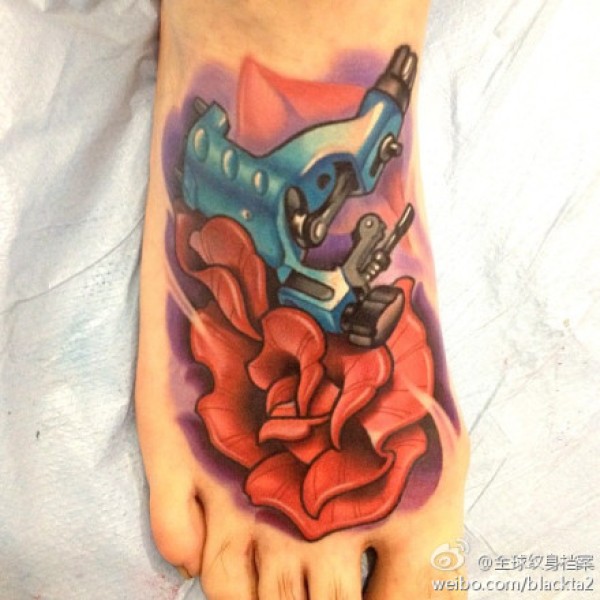 女生脚背时尚经典的玫瑰与马达机纹身图案_玫瑰花纹身图案大全_纹身图吧