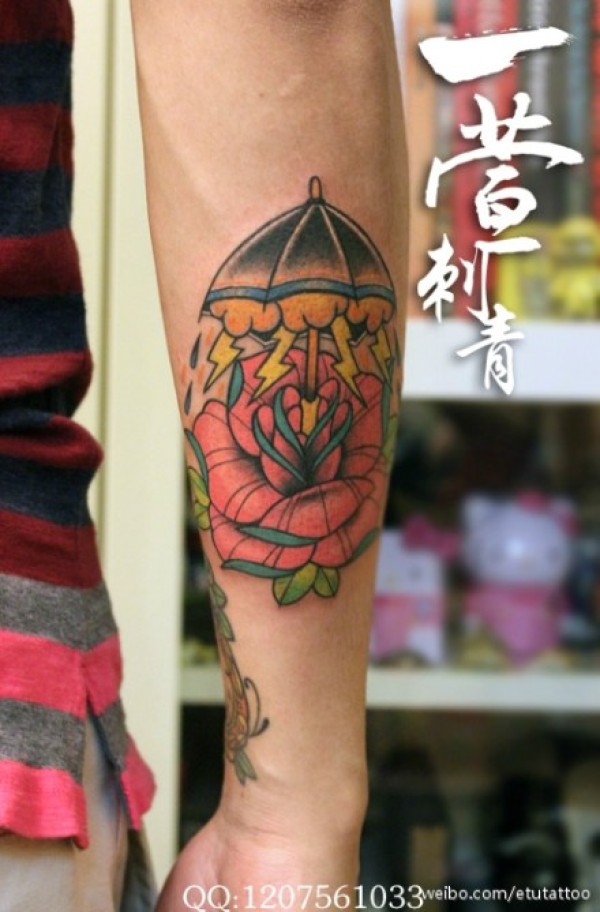 手臂时尚潮流的玫瑰雨伞乌云闪电纹身图案_玫瑰花纹身图案大全_纹身图吧