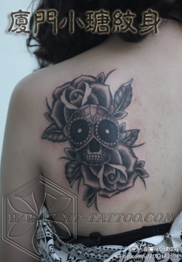 女生后肩背唯美小巧的黑灰骷髅与玫瑰纹身图案_玫瑰花纹身图案大全_纹身图吧