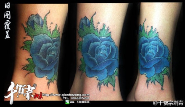 女生腿部潮流精美的蓝玫瑰纹身图案_玫瑰花纹身图案大全_纹身图吧