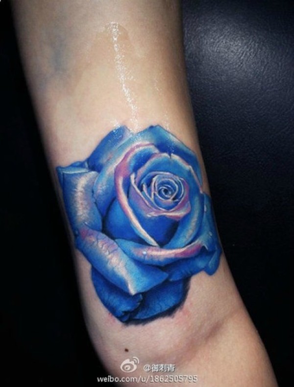 一款漂亮精美的彩色写实蓝玫瑰纹身图案_玫瑰花纹身图案大全_纹身图吧