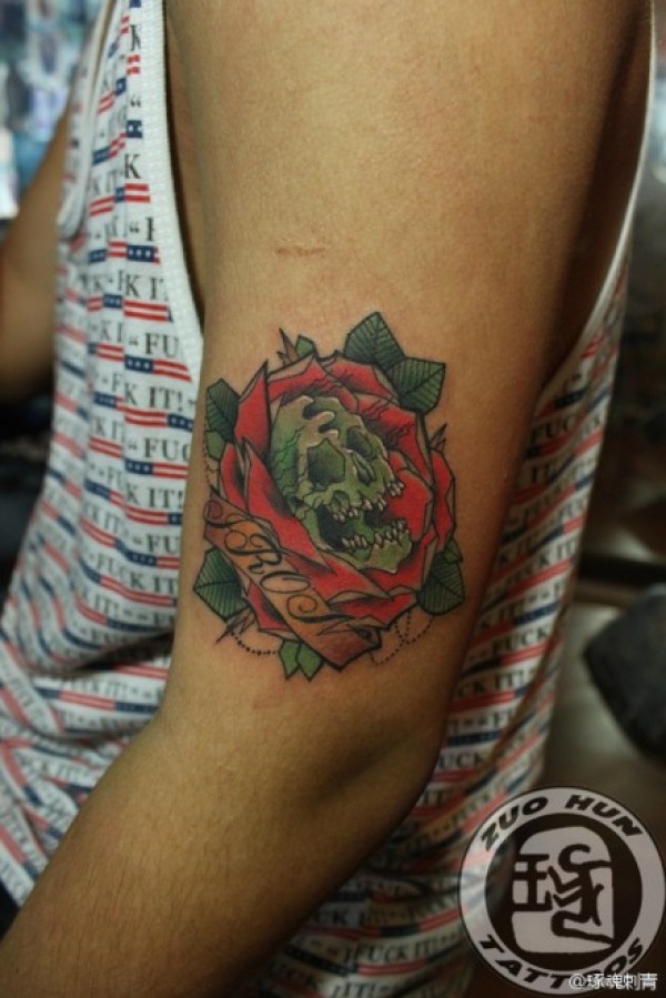 手臂经典另类的玫瑰与骷髅纹身图案_玫瑰花纹身图案大全_纹身图吧