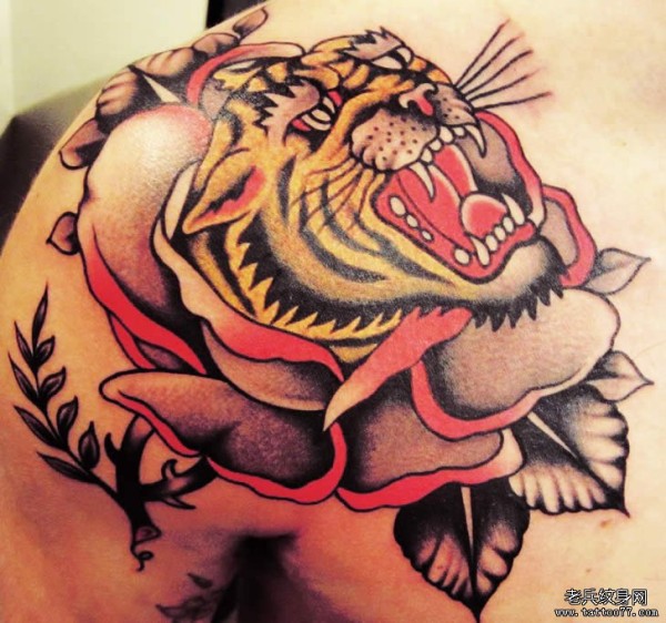 分享一款玫瑰花老虎纹身图案_玫瑰花纹身图案大全_纹身图吧