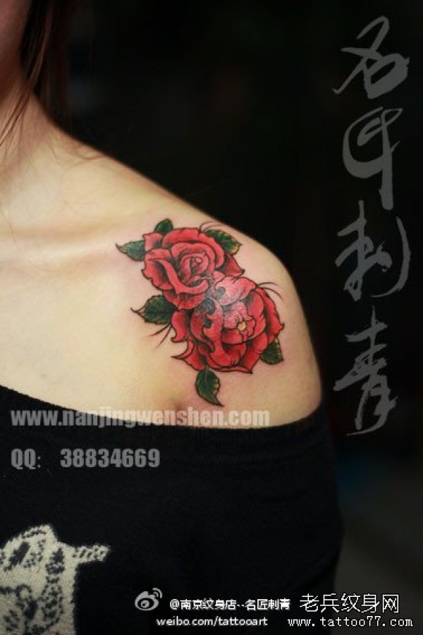 女生肩膀处经典好看的彩色玫瑰花纹身图案_玫瑰花纹身图案大全_纹身图吧