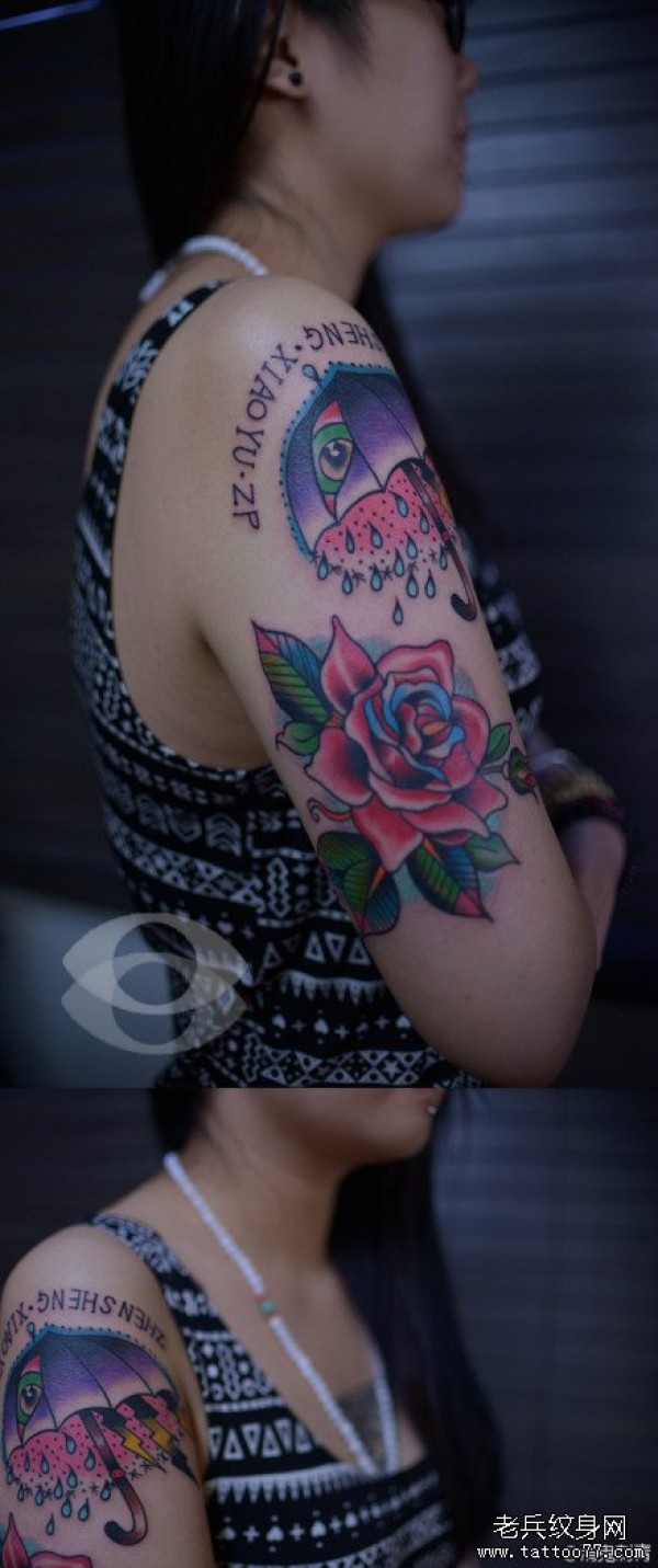 手臂时尚潮流的雨伞与玫瑰花纹身图案_玫瑰花纹身图案大全_纹身图吧