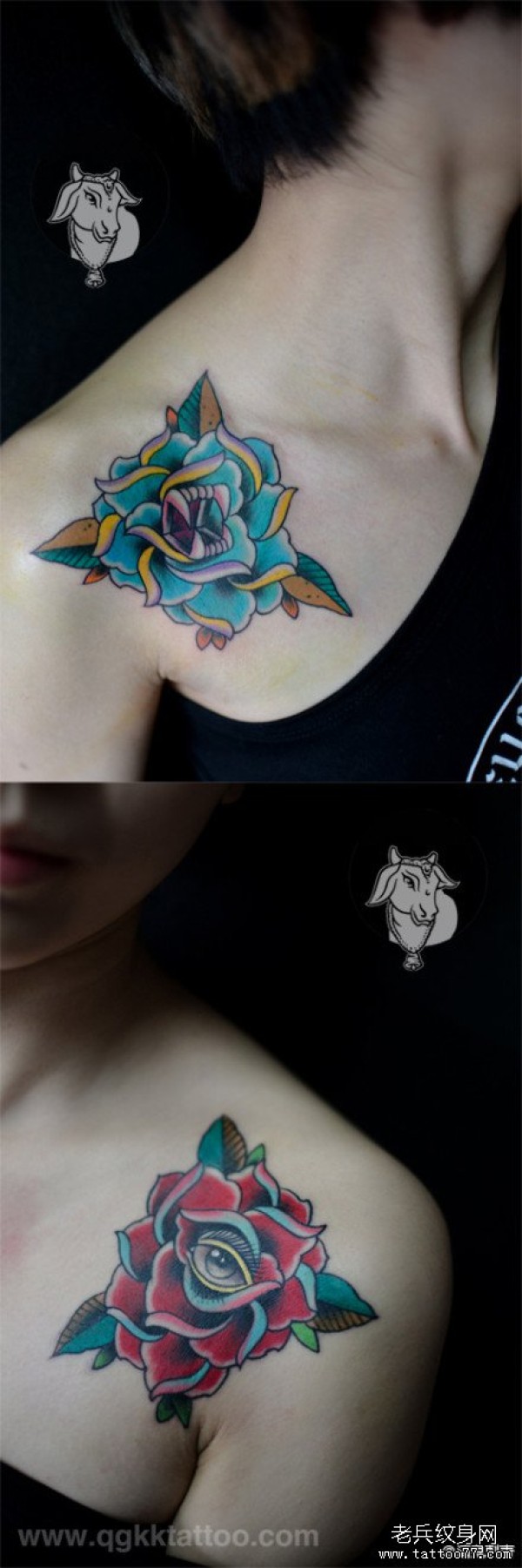 女生肩膀处好看潮流的玫瑰花牙印眼睛纹身图案_玫瑰花纹身图案大全_纹身图吧
