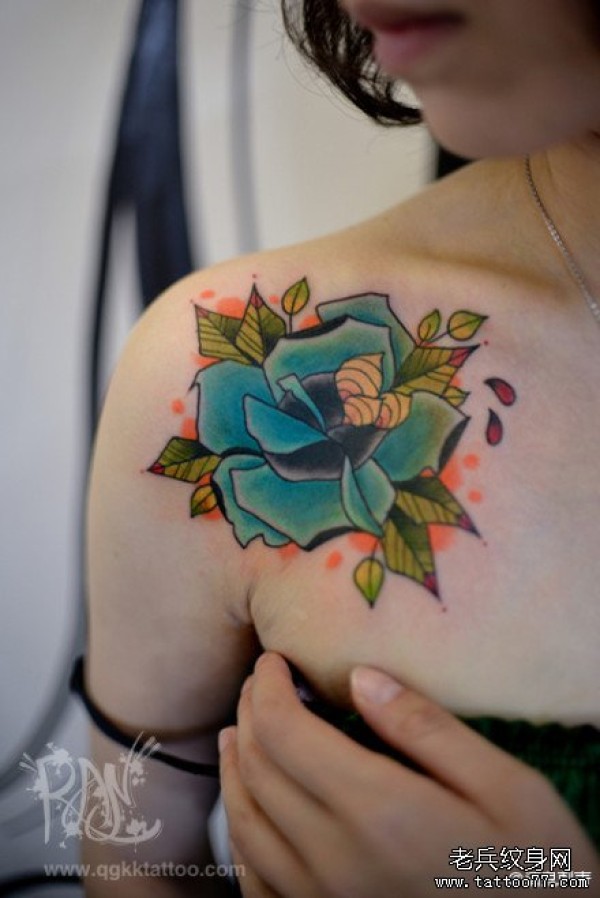 女生肩膀处漂亮精美的彩色玫瑰花纹身图案_玫瑰花纹身图案大全_纹身图吧