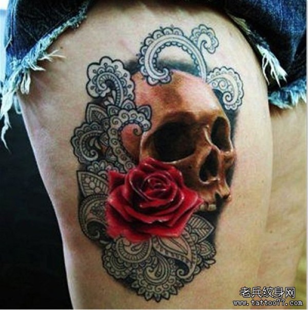 一款女人腿部经典的骷髅玫瑰花与蕾丝纹身图案_玫瑰花纹身图案大全_纹身图吧