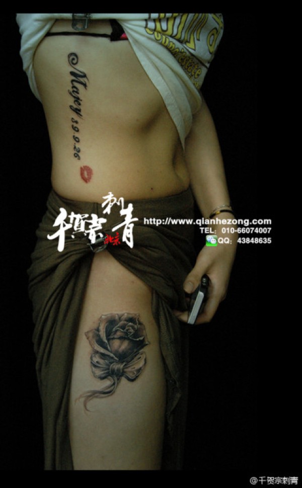 美女腿部潮流写实的玫瑰花与蝴蝶结纹身图案_玫瑰花纹身图案大全_纹身图吧