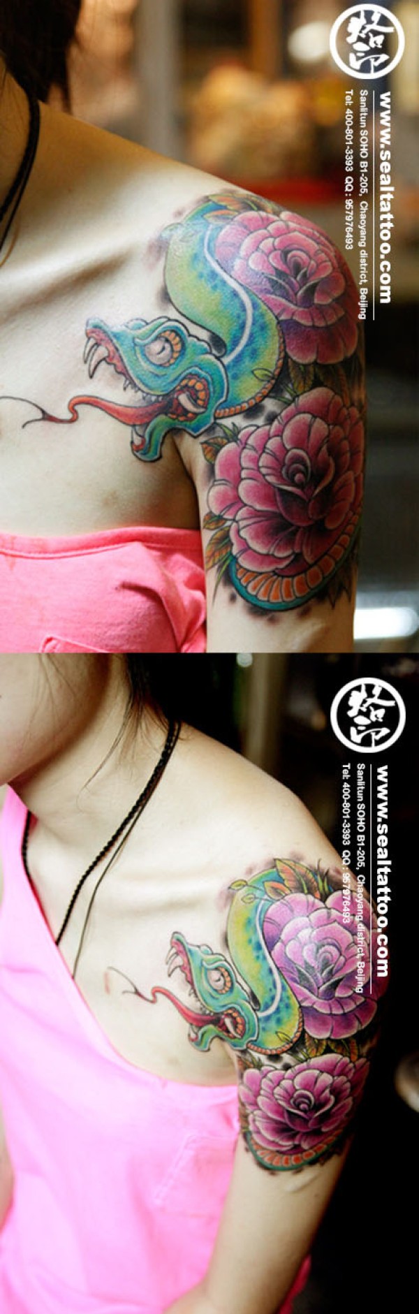 女生手臂漂亮经典的彩色蛇与玫瑰花纹身图案_玫瑰花纹身图案大全_纹身图吧